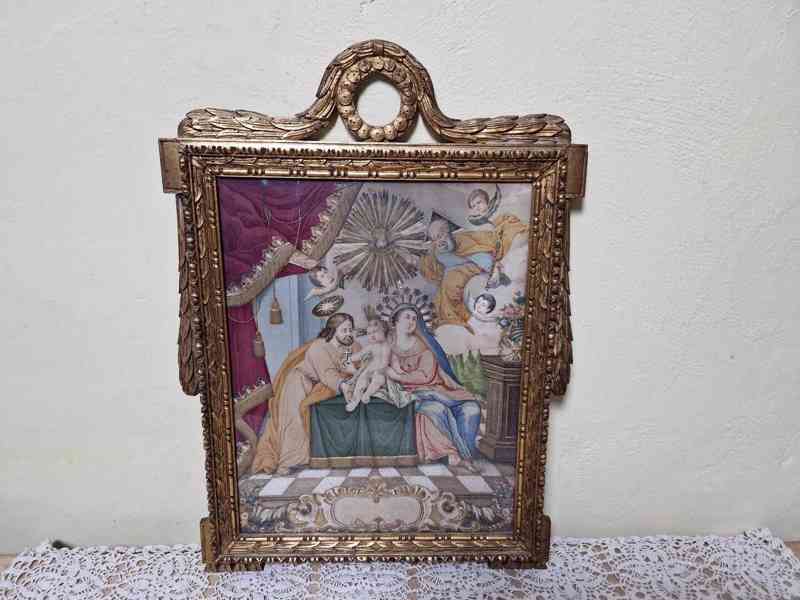 Krásný klasicistní malovaný obraz, koláž, krásný dobový řezaný rám, zaskleno.