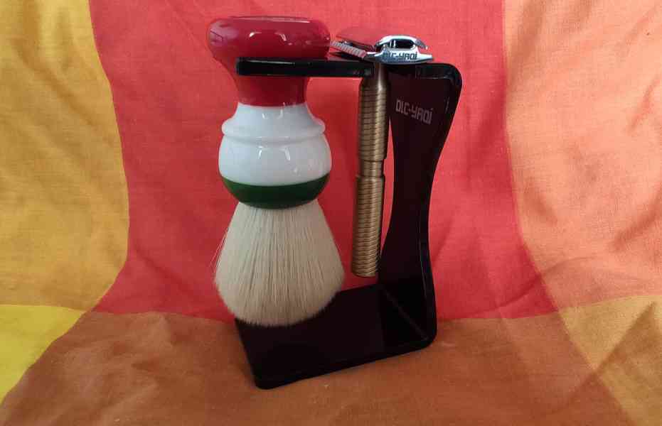 nabízím nový set stojánek z ABS černého plastu a štětce na holení. Stojánek může držet strojek a štětec. Štětec max. 26 mm K tomu přidávám YAQI Freedom Italian Flag Cashmere Synthetic. Uzel 24 mm. Holící štětec má rukojeť z pryskyřice v barvách Italské vlajky a vlákno je ze syntetiky, které je velmi jemné. Stojánek je z ABS plastu a rozměry jsou:
