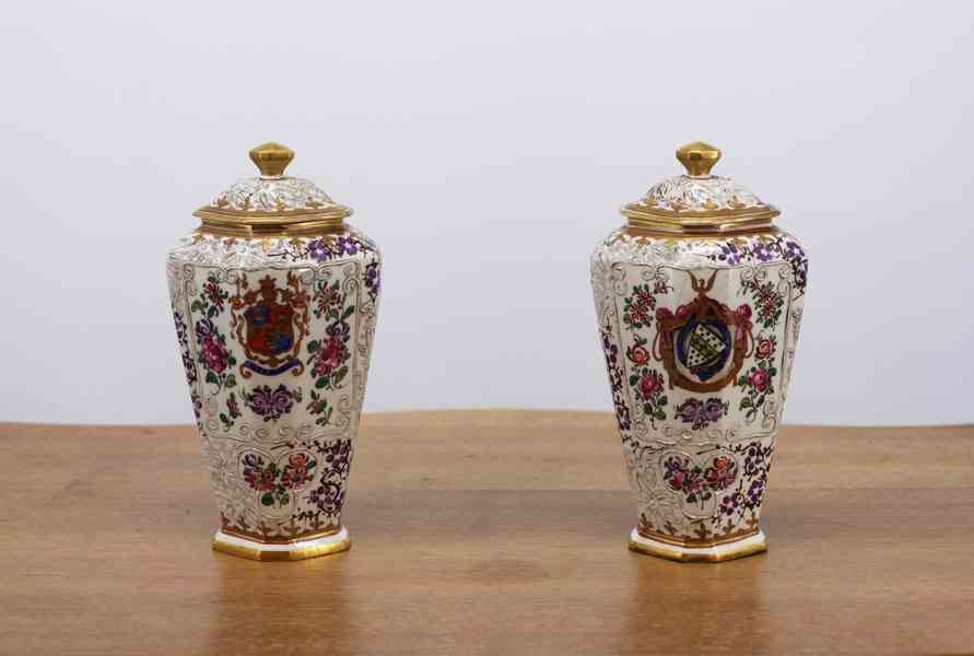 Elegantní pár porcelánových váz s víky z dílny Samson, bohatě ručně malované jemným květinovým dekorem v polychromii. Vázy mají výrazný plastický reliéfní ornament, zlacené okraje a kartuše s malovanými erby, což jim dodává reprezentativní a šlechtický charakter. Typický je mnohostěnný tvar, kvalitní porcelán a precizní ruční práce.