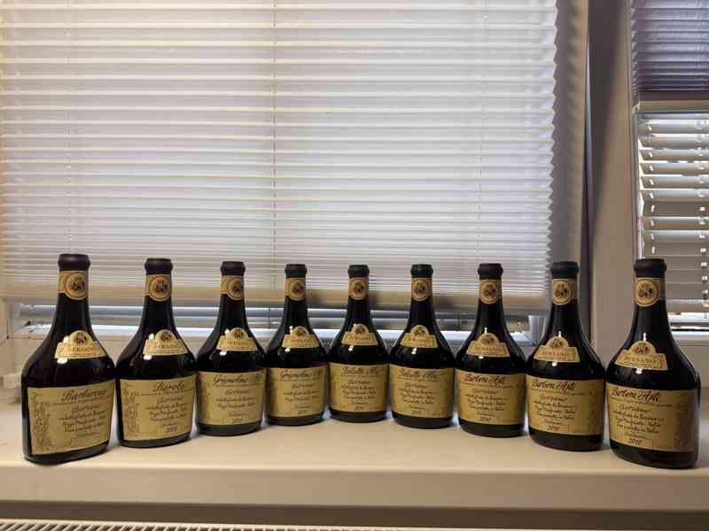 Barolo: Také známé jako "král vín", vyrábí se z hroznů Nebbiolo pěstovaných v obcích Barolo. Láhev vedle Barbaresca je ročník 2008.