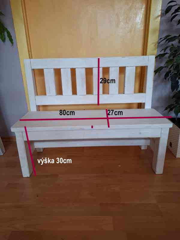 Prodám novou dětskou dřevěnou lavičku z masivu vyrobenou na zakázku.Délka 80cm,Výška 30cm,Výška opěradla 29cm a šířka sedu 27cm.