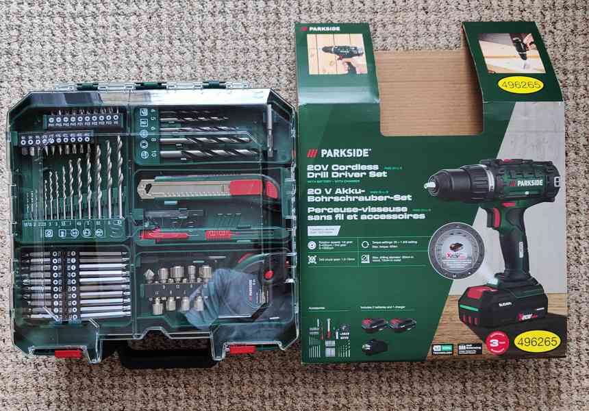 Nová aku vrtačka Parkside s bohatým příslušenstvím, 2 akumulátory, nabíječka, sada nářadí. 3 roky záruka u LIDL.