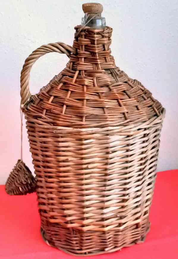 Prodám starý skleněný opletený demížon z 50-tých let 20.století. Výška 40 cm, obsah 5 l.
