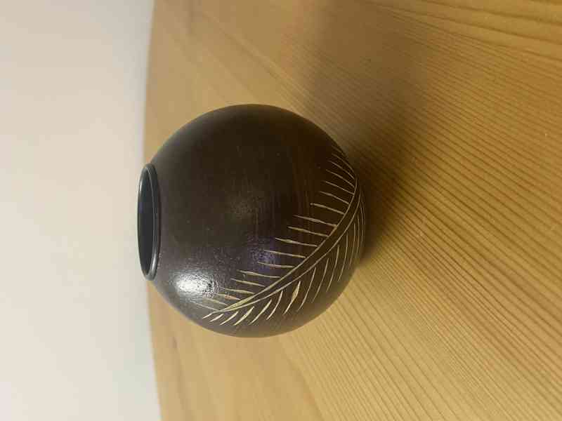 Nabízím kulatou dekorační vázu tmavě hnědé barvy se zlatým motivem listu. Vhodná na sušené květiny nebo jen jako stylový doplněk do interiéru.