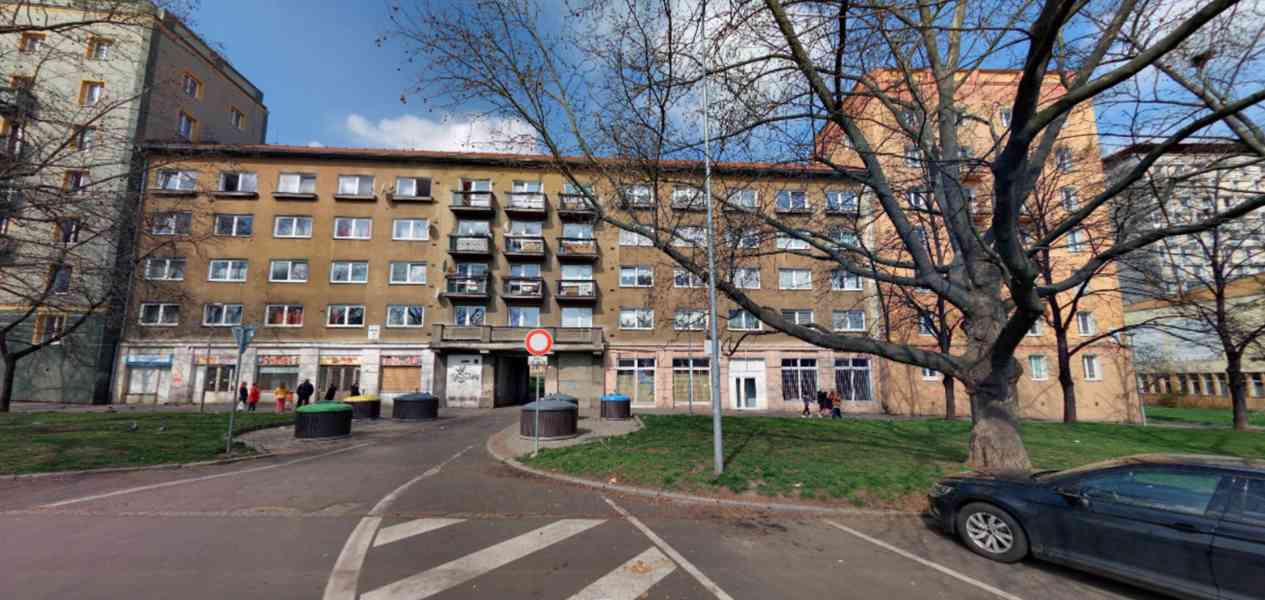 Dispozice: prostorný obývací pokoj (cca 30 m²) s výhledem do ulice, ložnice a kuchyně s okny do klidného, zatravněného vnitrobloku.