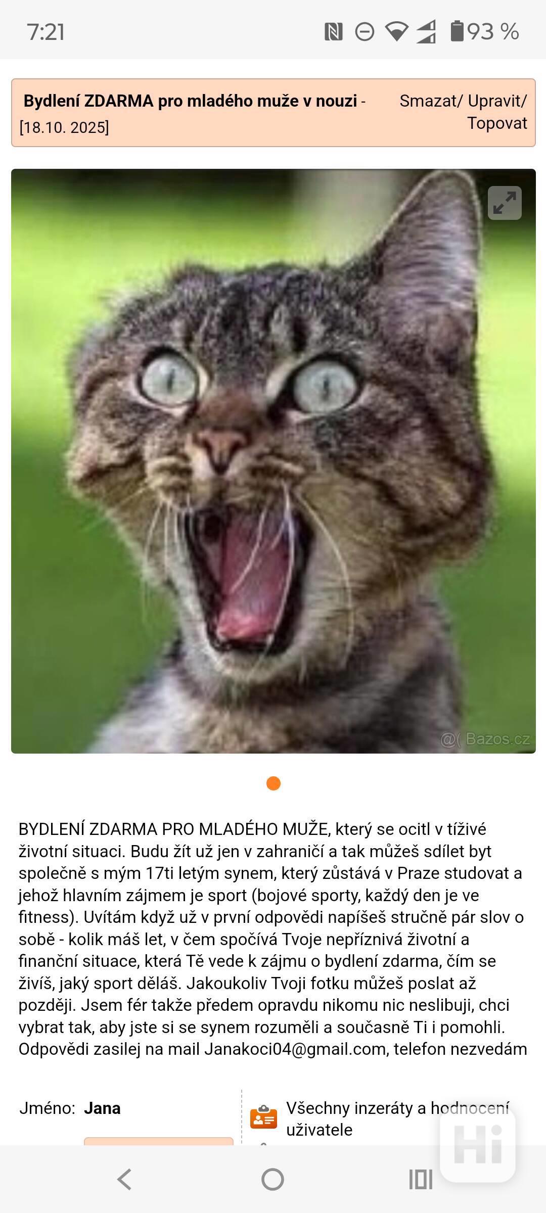 BYDLENÍ ZDARMA PRO MLADÉHO MUŽE který se ocitl v tíživé životní situaci. Budu už jen v zahraničí a můžeš sdílet byt společně s mým 17ti letým synem, který zůstává v Praze studovat a jehož hlavním zájmem je sport (bojové sporty, každý den fitness). Uvítám když už v první odpovědi napíšeš velmi stručně pár slov o sobě - kolik máš let, v čem spočívá Tvoje nepříznivá životní a finanční situace, která Tě vede k zájmu o bydlení zdarma, čím se živíš, jaký sport děláš. Fotku můžeš poslat až později. Jsem fér takže předem opravdu nic neslibuji chci vybrat abych někoho abych pomohla a rozuměli jste si. Kontakt na mail Janakoci04@gmail.com