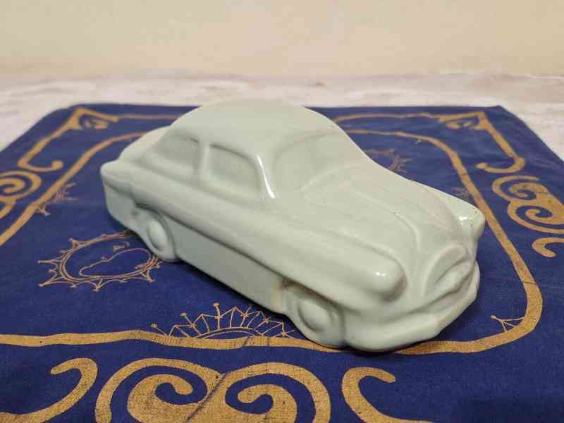 Keramická kasička, Škoda 440 Spartak, barva krémová světle zelená - vyrobila Terra Teplice, 2 pol. 50 let 20 stol.