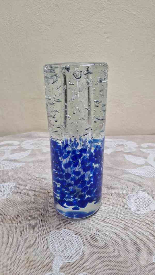 Masivní modrá Váza s bublinkami, čiré a modré hutně zpracované sklo - J. Svoboda, Škrdlovice, 60 léta 20 stol.