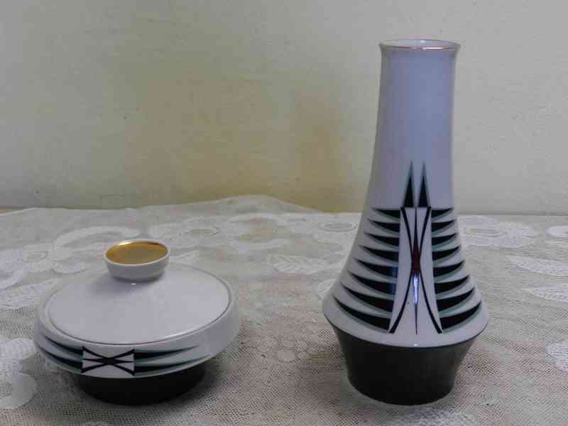 Zajímavý set, porcelánová Váza a Dóza, Bruselský styl, barva zeleno-bílá s černou a vínovou, u dózy navíc zlacení - Royal Dux, kolem 60 let 20 stol.