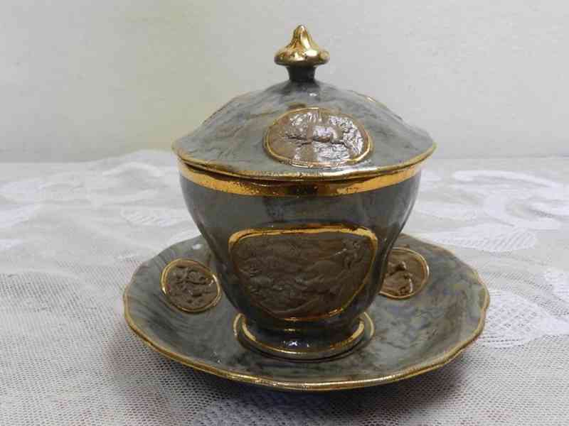 Zajímavý a vzácný zlacený porcelánový Hrnek s pokličkou a miskou z období Biedermeieru, na misce a pokličce plastické medailony s různými motivy, speciální úprava povrchu (CHROMOLIT), masivní silnostěnné provedení, velmi kvalitní zpracování, krásný muzeální kus - Značeny oba kusy, PS Chodov, 1 pol. 19 stol.