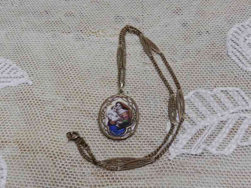 Krásná velmi stará malovaná větší madonka na porcelánu, krásný výrazný rámeček, komplet s řetězem.