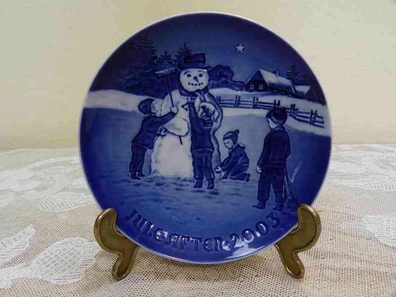 Krásný sběratelský dekorační Talíř se sněhulákem, kobaltová modř, vánoční motiv, 2003 - Copenhagen Grondahl, Dánsko.