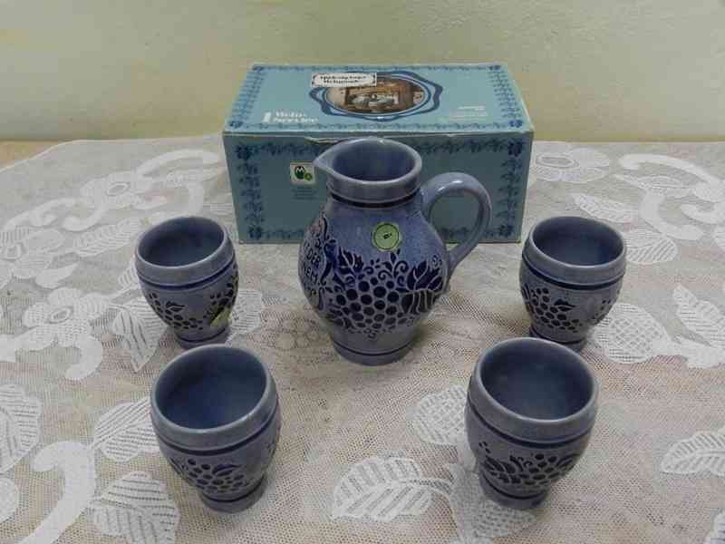 Hezká sada na víno, keramický Džbánek (cejch 0,5l) a 4 kalíšky, nepoužité, orig. krabice - Německo, 3 třetina 20 stol.