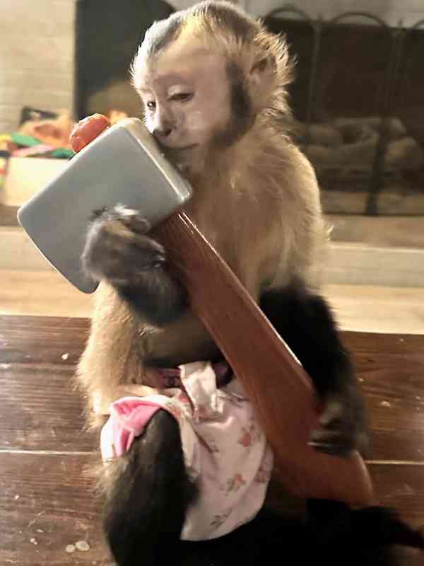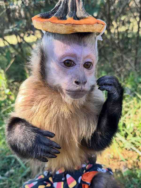 Bílolící samice kapucínské opice pro vaši rodinu. Je velmi milá a rozkošná! Tato opice je vycvičená na domov, naučená na plenky a vodítko a nosí oblečení. Je očkovaná, inteligentní, akrobatická a velmi zdravá. Rozkošná s dětmi a hodná k ostatním domácím mazlíčkům. Je vycvičená na domov a hravá s ostatními domácími mazlíčky.