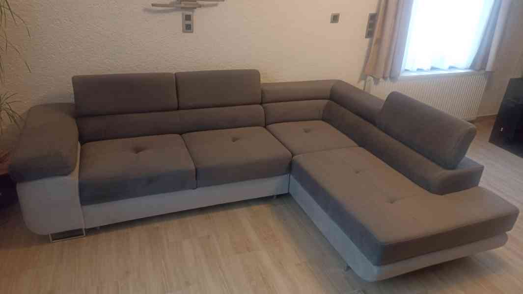 Prodám 3 měsíce používanou rohovou rozkládací sedací soupravu ANTON. Rozměry: délka 275 cm x hloubka 202 cm x výška 70 - 90 cm, hloubka sedu 60 cm, výška sedu 43 cm, prostor na spaní po rozložení 125 x 193 cm. Sedačka je jako nová, v záruce, prodávám z důvodu špatně zvolených rozměrů. Původní cena 26 000,- Kč, prodám za 18 000,- Kč.